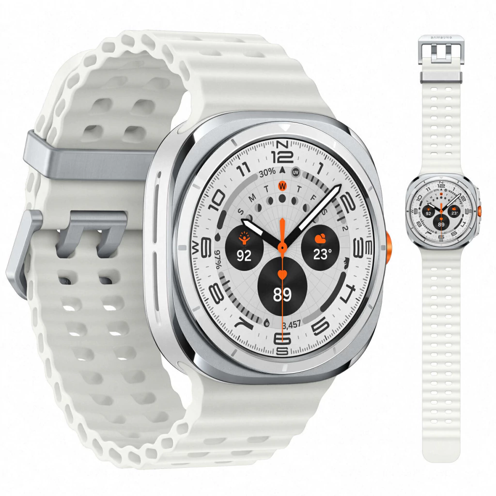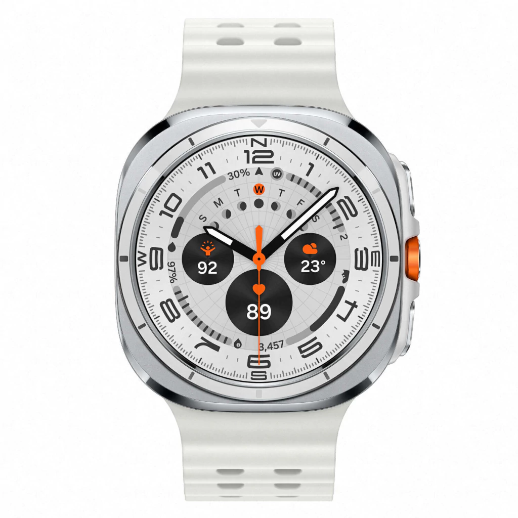 El Samsung Galaxy Watch Ultra 47 mm Titanium White es un reloj inteligente de alta gama diseñado para quienes buscan precisión, resistencia y autonomía. Su cuerpo de titanio y pantalla Super AMOLED de 1,5″ con brillo de hasta 3000 nits garantizan visibilidad incluso bajo sol directo. Incorpora sensor BioActive, GPS de doble frecuencia, conectividad LTE y compatibilidad con Galaxy AI para un monitoreo avanzado de salud y rendimiento físico.